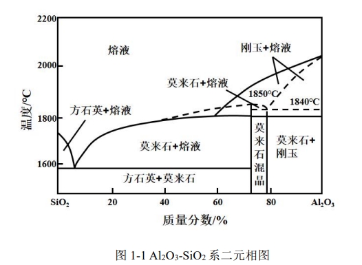 耐火浇注料是由一定级配的骨料、细粉、结合剂和外加剂按一定比例组成的耐火混合料,因其具有生产工艺简单、生产周期较短、节能等优点被广泛使用。 高铝系列耐火浇注料是由 Al2O3和SiO2作为基本化学组成的耐火浇注料。高铝系列耐火浇注料的相组成可以从 Al2O3-SiO2 系相图得到。从图1-1可以看出,Al2O3的熔点为2050 ℃,SiO2的熔点为1723 ℃。在该系统中,唯一稳定的二元化合物为莫来石,其化学组成为3Al2O3·2SiO2(Al2O3为71.8%,SiO2为28.2%),莫来石的熔点为1850 ℃。由于莫来石的存在,系统被划分为两个子系统:SiO2-莫来石子系统,固化温度为1595 ℃,共晶点组成接近SiO2一侧,以及Al2O3-莫来石子系统,固化温度为1840 ℃,共晶点组成接近Al2O3一侧。