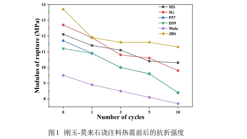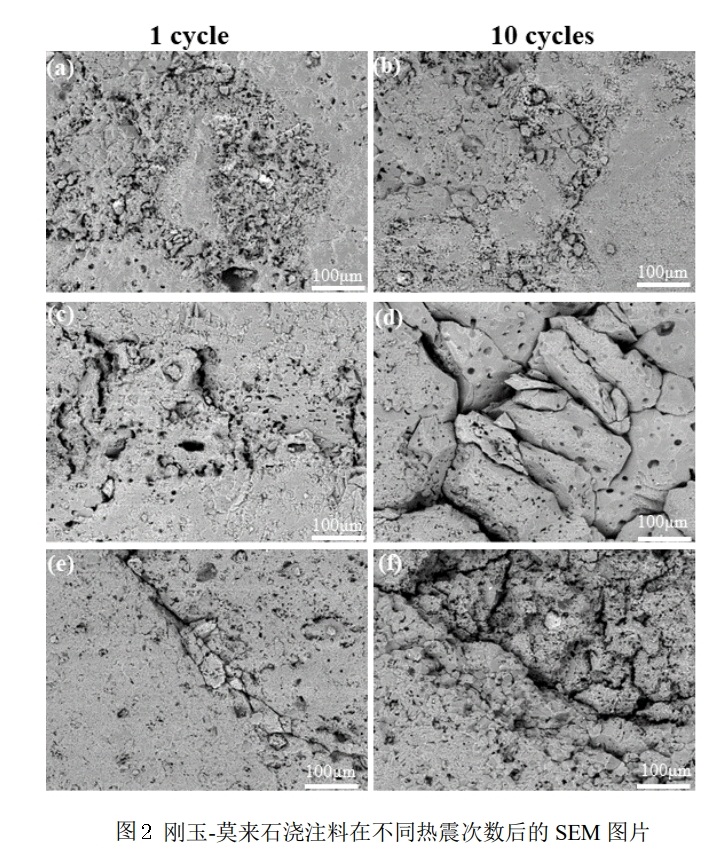 各种浇注料在不同热震次数后的抗折强度如图1 所示。由图1可以看出,随着热震次数的增加,各浇注料的强度均逐渐降低,并且经过1次循环后浇注料的抗折强度下降最为剧烈。这是因为在首次热震过程中所产生的热应力较高,导致浇注料裂纹的生成及快速扩展,使浇注料的抗折强度急剧下降。在第3次和5次循环后各浇注料的抗折强度的减小均逐渐趋于平缓。此时,浇注料中的裂纹呈准静态扩展状态,裂纹的扩展速率较慢,使热震后的浇注料抗折强度下降较为平缓。在第10次循环后各试样的抗折强度再次下降较为剧烈。此时,由于热震次数累积,导致浇注料中的裂纹扩展尺寸较大,使得浇注料的抗折强度再次出现骤降现象。